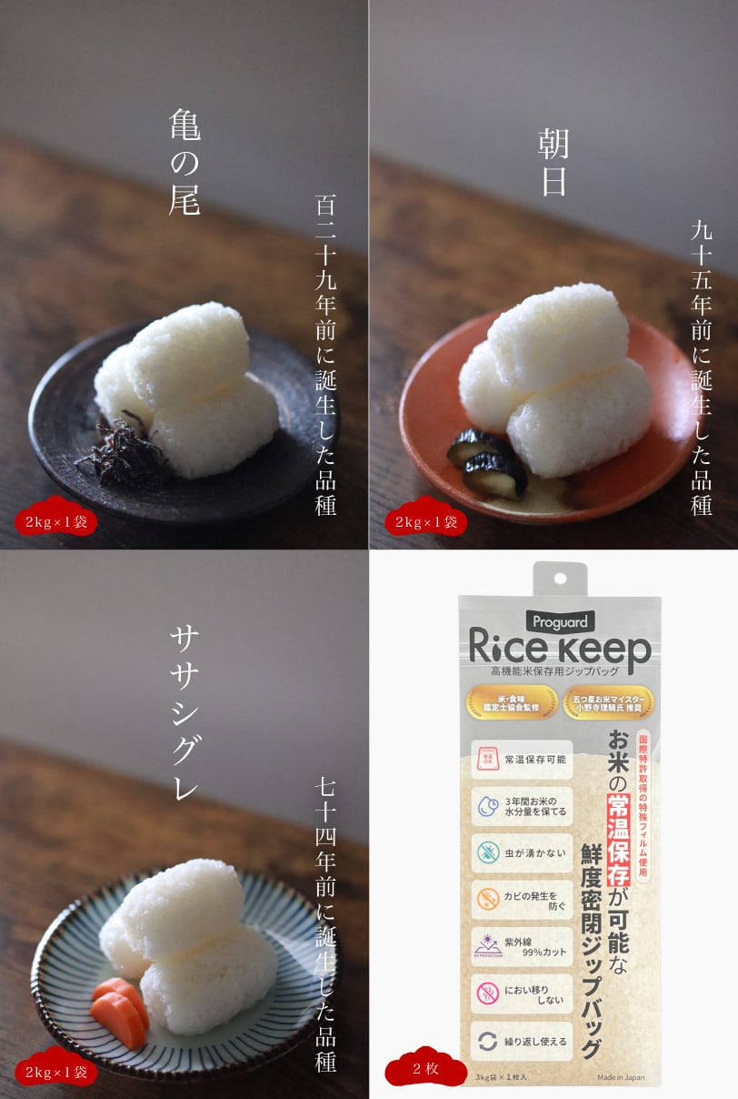 原種・在来種米3種(各2kg・合計6kg)を詰め合わせた、年始限定の特別セット。